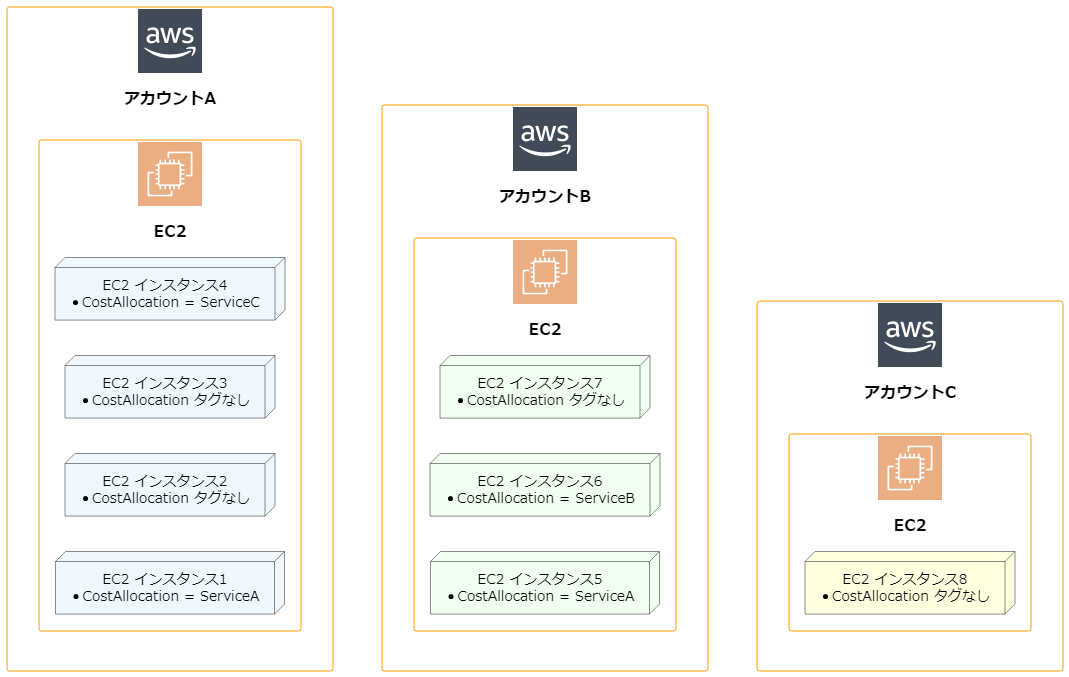 例えば、以下のような一括請求が有効な 3つの AWS アカウントがあり、コスト配分タグ CostAllocation がついたリソースのある環境があるとします。