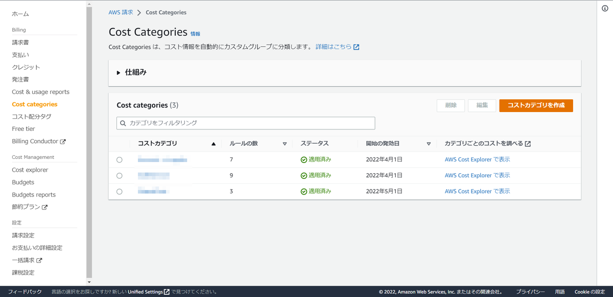 ここまで設定し、コストカテゴリを作成 をクリックすると作成されます。