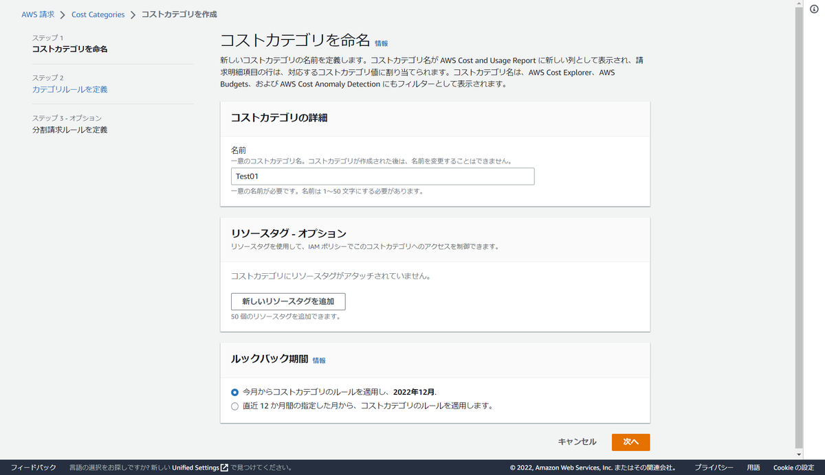 またルックバック期間も設定できます。通常はコストカテゴリを作成した当月のみ遡って使用できますが、ルックバック期間を設定すると最大12ヶ月間遡ってコストカテゴリを使用することが可能になります。 AWS Cost Categories がルールの遡及適用のサポートを開始