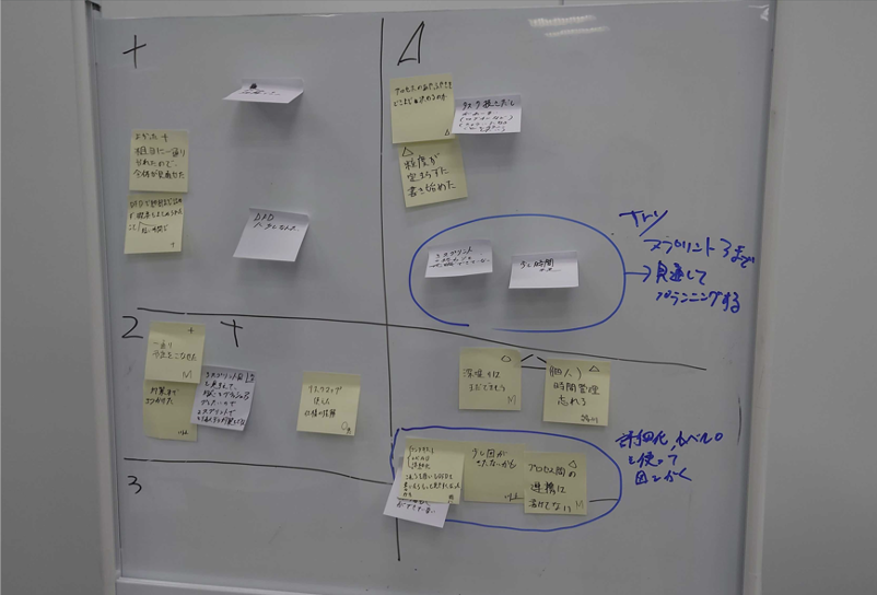 - ホワイトボードの2枚目は、ふりかえりの内容を書き出します。(【問4】に該当)
